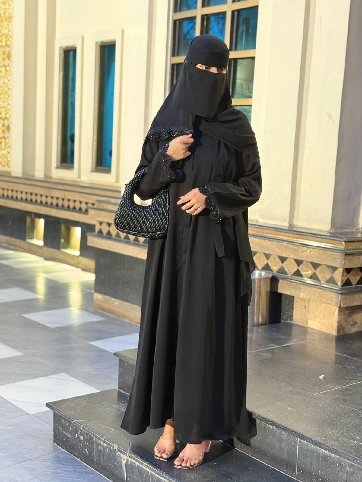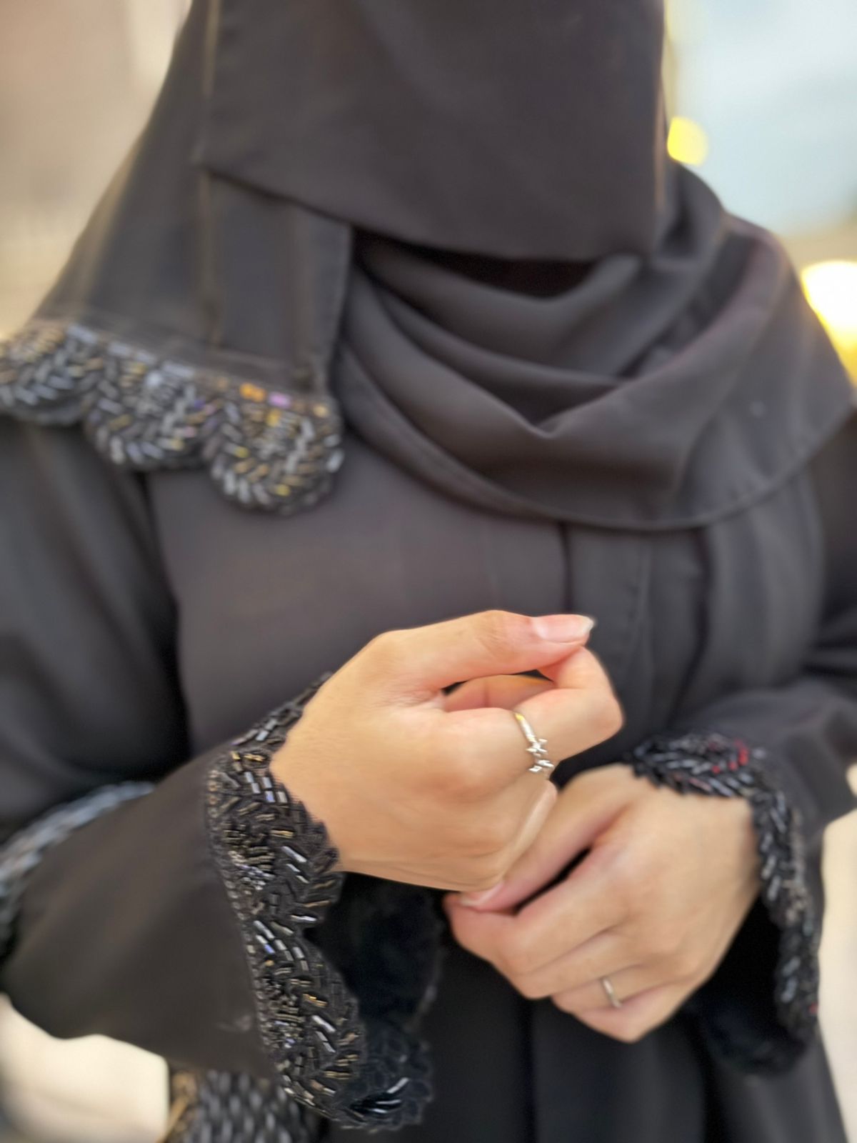 Beady Noir defines elegance with its beaded lace detailing and soft black finish. This Imported Nida abaya is perfect for special events or evening wear.